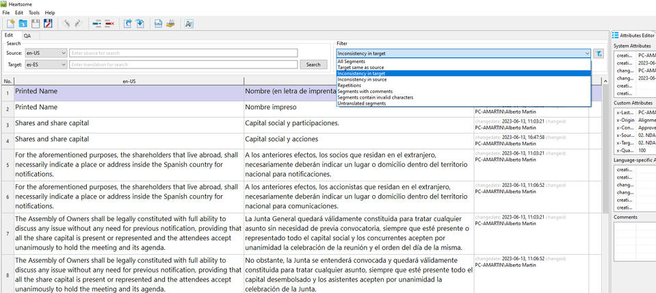 • Bilingual ExcelExcept for the last three ones, which are rather origin backup files, the programs that can recognize one or some of these formats are SDL Trados Studio, memoQ, Wordfast, Phrase (before Memsource) or OmegaT.The specialized tools through which I normally create the TMs and TBs or carry out the LQA are SDLXliff2Tmx, Glossary Converter, Golden Editor, XBench, Heartsome, TMX Editor, OmegaT Aligner, Trados Studio Aligner or MultiTerm.The Quality Assurance makes certain that there is no repetition, unnecessary tag automatically generated, inconsistency between the target and the source, numeric or tag mismatch, failure out of the alignment or double space. Although some false positives are likely to appear, it is the best way to raise the standard to 100% quality and to result in clean databases.Please don't hesitate to request an obligation-free quote or inquire at the contact addresses shown below. More services here.