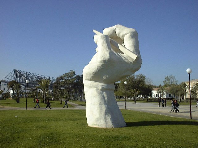 In 2005 I graduated with the Degree in Translation and Interpreting of English to Spanish, and German as second foreign language, and with the Sworn Translator Certificate of English (appointed by the Spanish Foreign Office) at the University of Alicante (UA). My education also includes an academic year at Bangor University (Wales) and a quarter at the UPF of Barcelona.Since then, I have been a European volunteer in Stuttgart, taught languages, worked in the international or corporate department of several companies and honed my translation prowess by making incursions into different fields.As it happens with the specialization in audiovisual translation at Jaume I University or in the literary field at Complutense University of Madrid, the mentioned Degree at the UA was focused on legal and commercial translation. Renowned masters, as Alcaraz and Hughes, lectured. This was the perfect background for my later career handling corporate texts and trade processes.The sculpture of the giant writing hand above is called Dibuixant l'espai (Drawing the space) and can be found in this university. It represents the values of free knowledge and, at the same time, the creation of literature, arts, science and business relations, which translation is exactly about by bridging the invisible boundaries of global life, as my motto says. You can't see what the hand is writing, but it is.